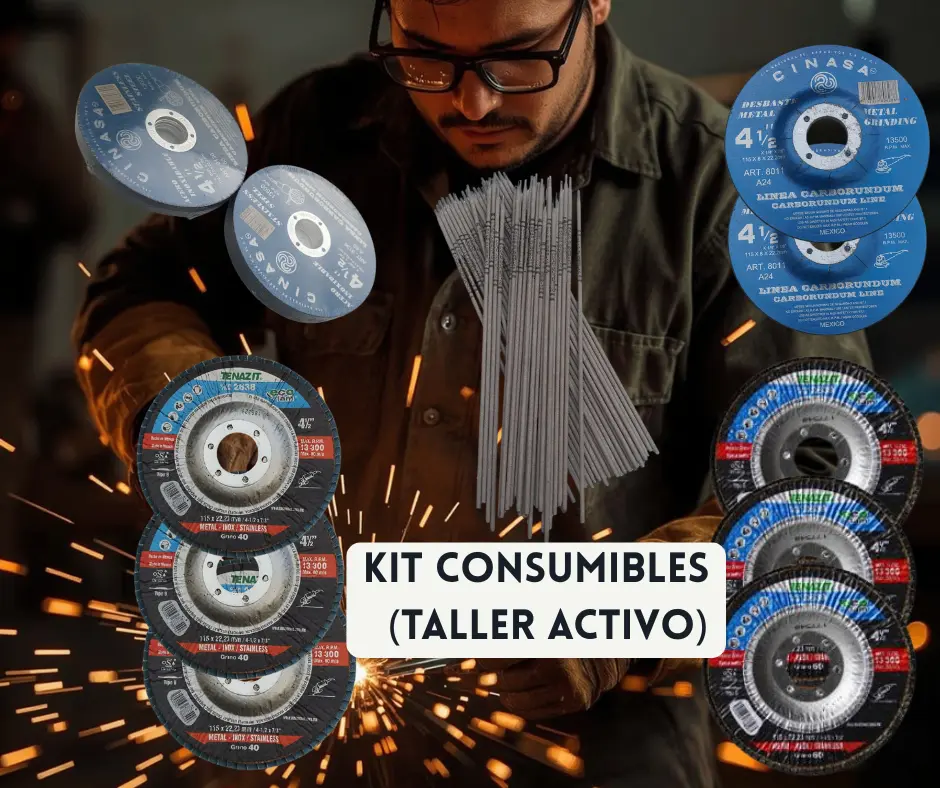 El kit está pensado para talleres, herreros y soldadores que trabajan con acero y materiales comunes. Es versátil: incluye consumibles para corte, desbaste y soldadura.